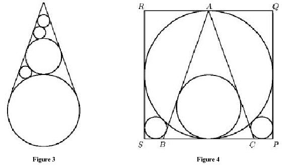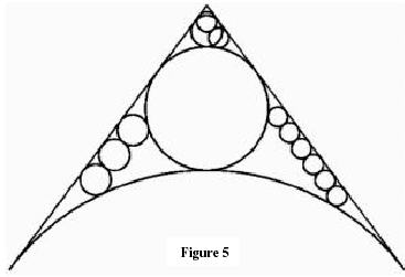 В задаче 1 из трёх малых равных окружностей две лежат в области, ограниченной касательными и средней окружностью, а третья — в области, ограниченной двумя крупнейшими окружностями и одной из касательных. Задача говорит, что тогда отношение радиусов двух крупнейших окружностей равно 2. Рассматривая эту задачу, мы нашли следующий удивительный факт (Okumura, Sodeyama, 1998): если даны 2 внешне соприкасающиеся окружности разных радиусов и две их общие касательные, и если даны 4n равных малых окружностей, n из которых лежит в криволинейном треугольнике, образованном этими касательными и средней окружностью, а остальные 3n лежат в одном из криволинейных треугольников, образованном двумя большими окружностями и одной из касательных, как это показано на рисунке 5 (для случаев n=1 и n=2), то отношение радиусов двух крупнейших окружностей равно 4 для любого натурального n.