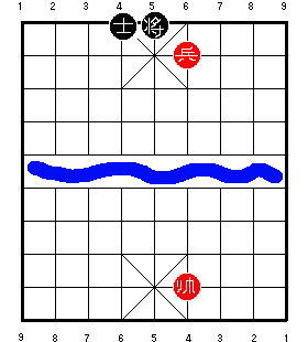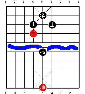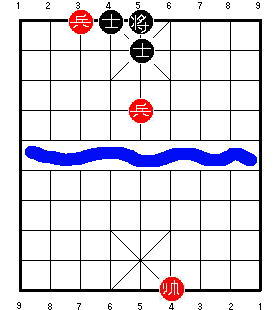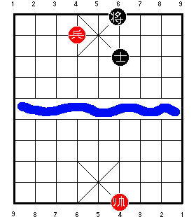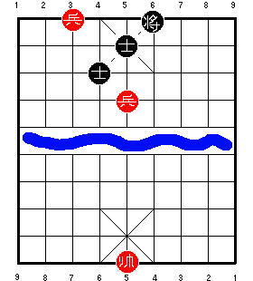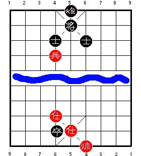Однако возможно, что они не видели ответа 3 K4=5, прикалывающего пушку. Теперь красные сыграют 4 P6+1, беря советника и делая свою пешку низкой. Но, поскольку чёрная пушка приколота, она не может вернуться и захватить эту пешку, чтобы победить. Если чёрные попытаются сыграть 4 ... K5=6 или 4 ... K5-1, то красные могут ответить 5 P6=5, и чёрные не смогут удержать их от размена пешки на остающегося чёрного советника. В результате позиция превратится в мёртвую ничью одинокой пушки против голого короля.