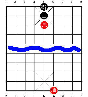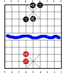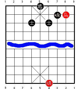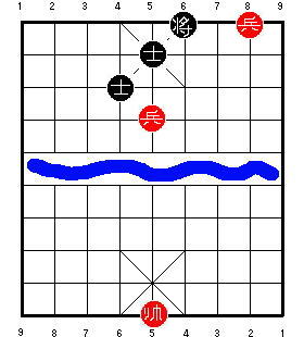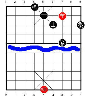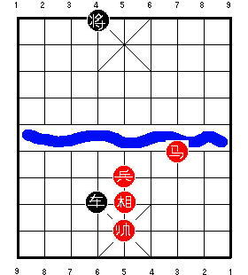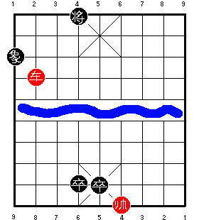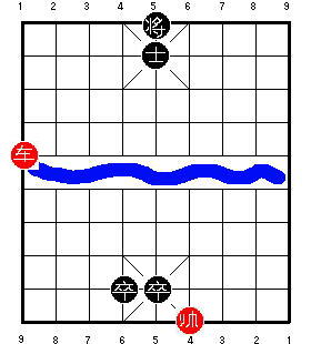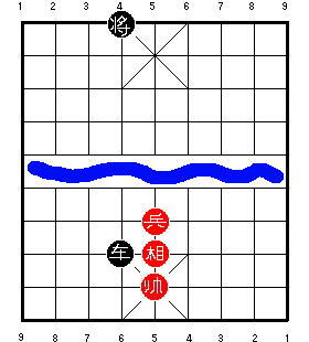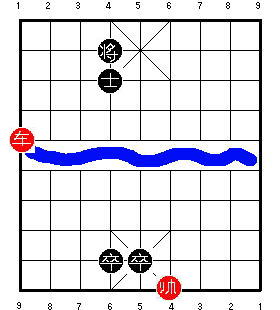 Здесь чёрный король стоит на центральной вертикали. После 1.R9=5, чёрные в цугцванге, и проигрывают. Разница в том, что на второй диаграмме ладья может приколоть советника к королю, одновременно удерживая центральную пешку. В результате одна ладья сдерживает все четыре фигуры чёрных, и красные могут победить.